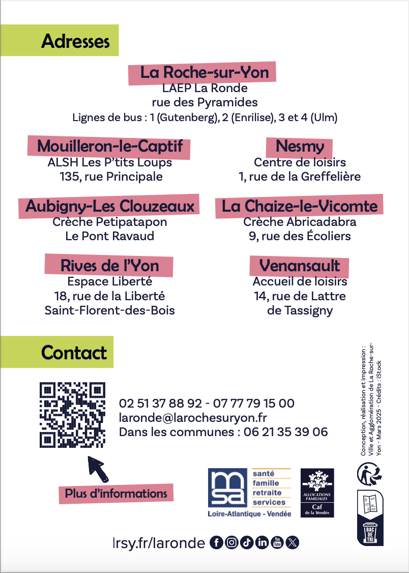 - 2 à 3 temps d' animation par semaine en alternance sur les communes d'Aubigny-Les Clouzeaux, Le Tablier, Les Rives de l'Yon et Nesmy