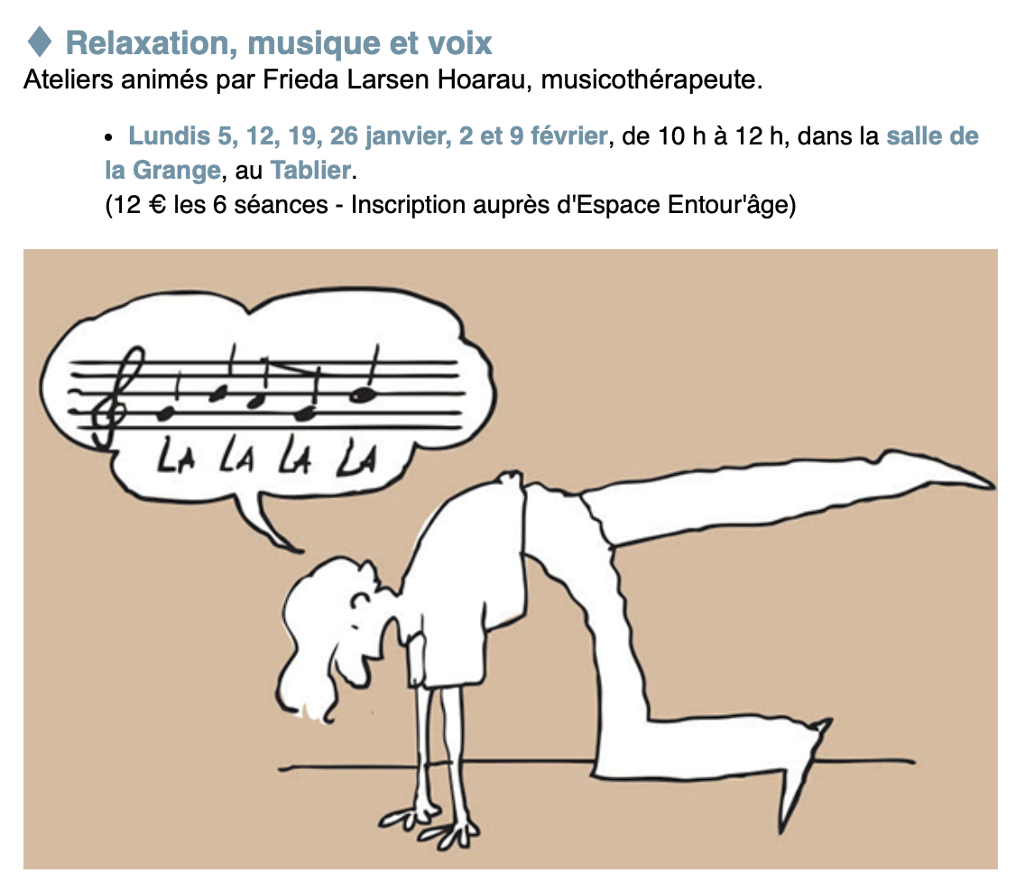 Atelier relaxation, musique et voix proposé en janvier et février par l'Espace entour'âge à la Grange