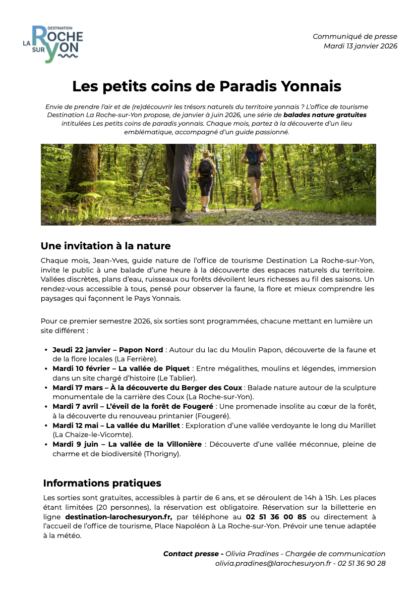 Les sorties sont gratuites, accessibles à partir de 6 ans, et se déroulent de 14h à 15h. Les places étant limitées (20 personnes), la réservation est obligatoire. Réservation sur la billetterie en ligne destination-larochesuryon.fr, par téléphone au 02 51 36 00 85 ou directement à l’accueil de l’office de tourisme, Place Napoléon à La Roche-sur-Yon. Prévoir une tenue adaptée à la météo.