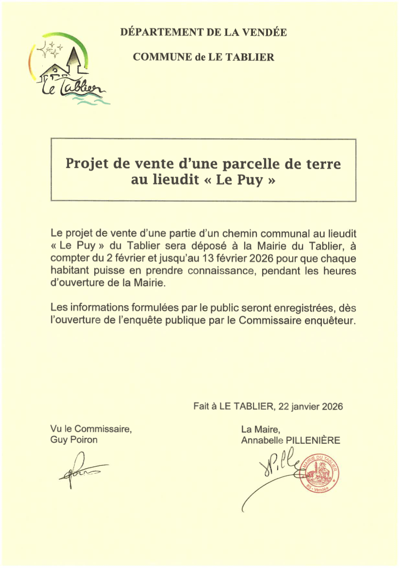 Avis d'enquête publique sur le projet de vente d'une partie d'un chemin communal au village du Puy